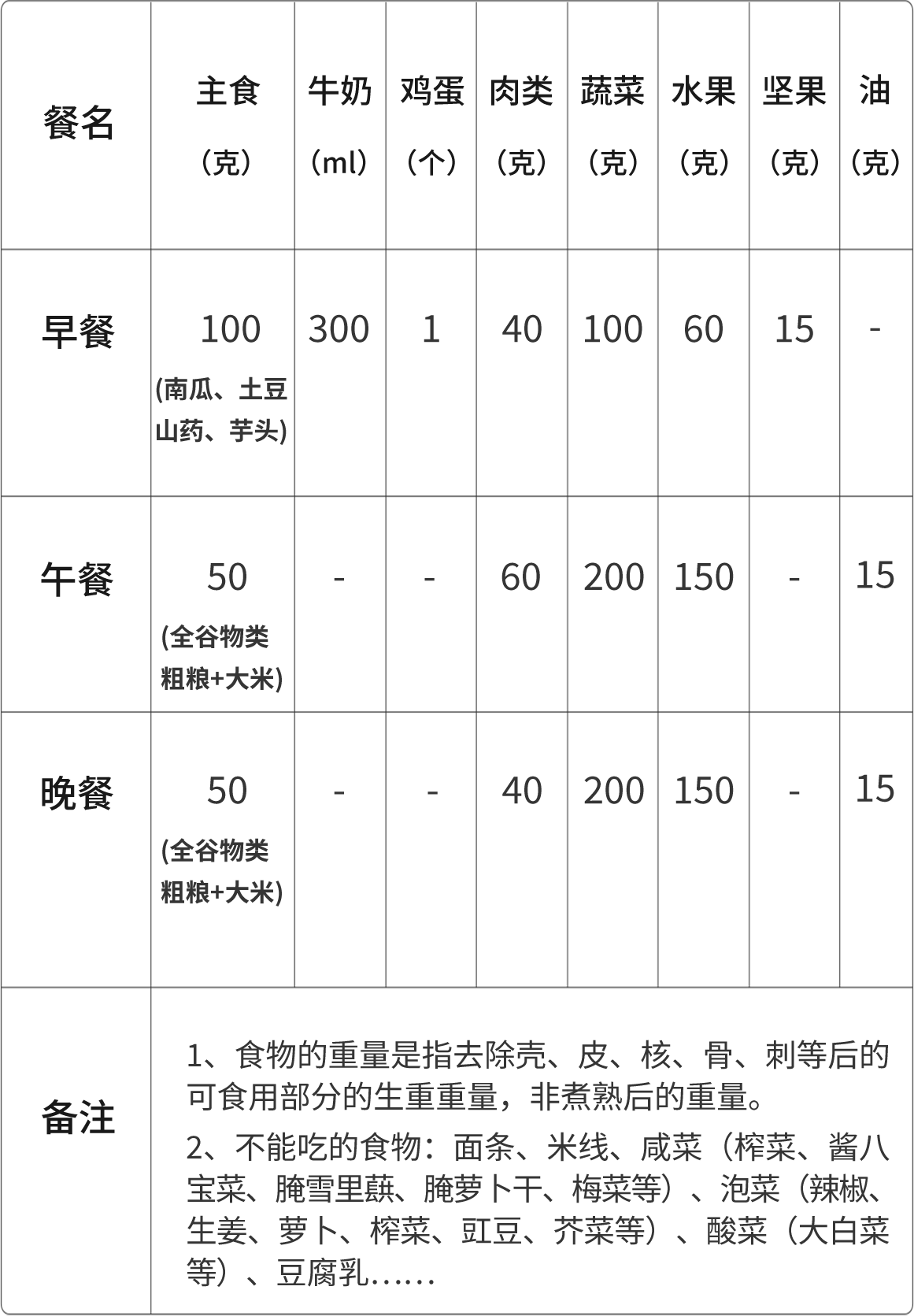 第6步  根据蛋白质、脂类、碳水化合物的含量换算成食物重量,制定实施细节(此处仅展示少部分细节):